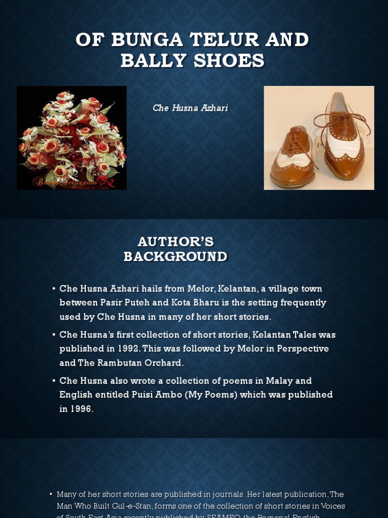 Enjoy Free Shipping Returns. Bunga Telur and Bally Shoes. I feel that the students will learn something from this short storyThank you to Dr Che Husna for the brilliant story she has wrote and thank you the Ministry of Education for giving the opprtunity to students to study this story in.